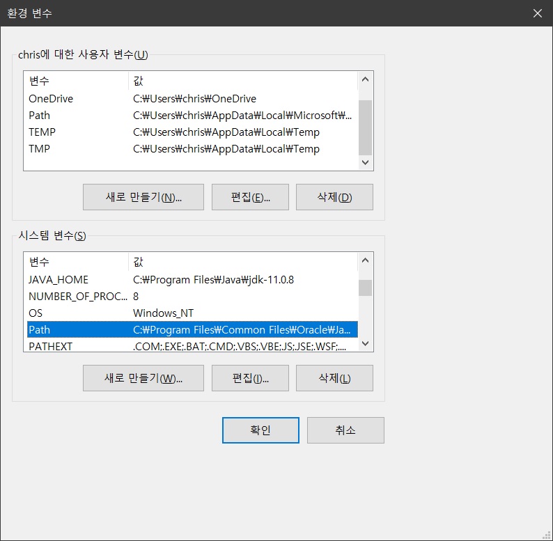 변수 값 : C:\Program Files\Java\jdk-11.0.8(Java가 설치된 경로를 적어주시면 됩니다!)