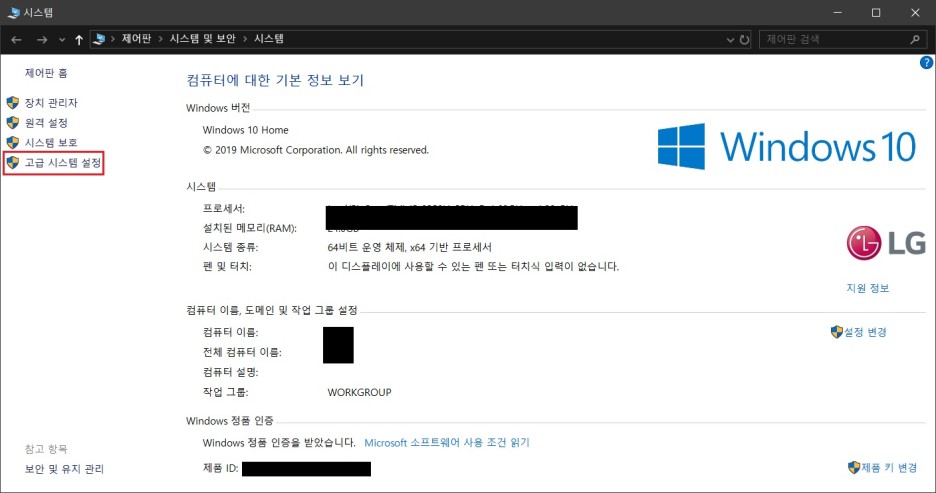 속성에 들어왔으면 좌측에 [고급 시스템 설정] 클릭!