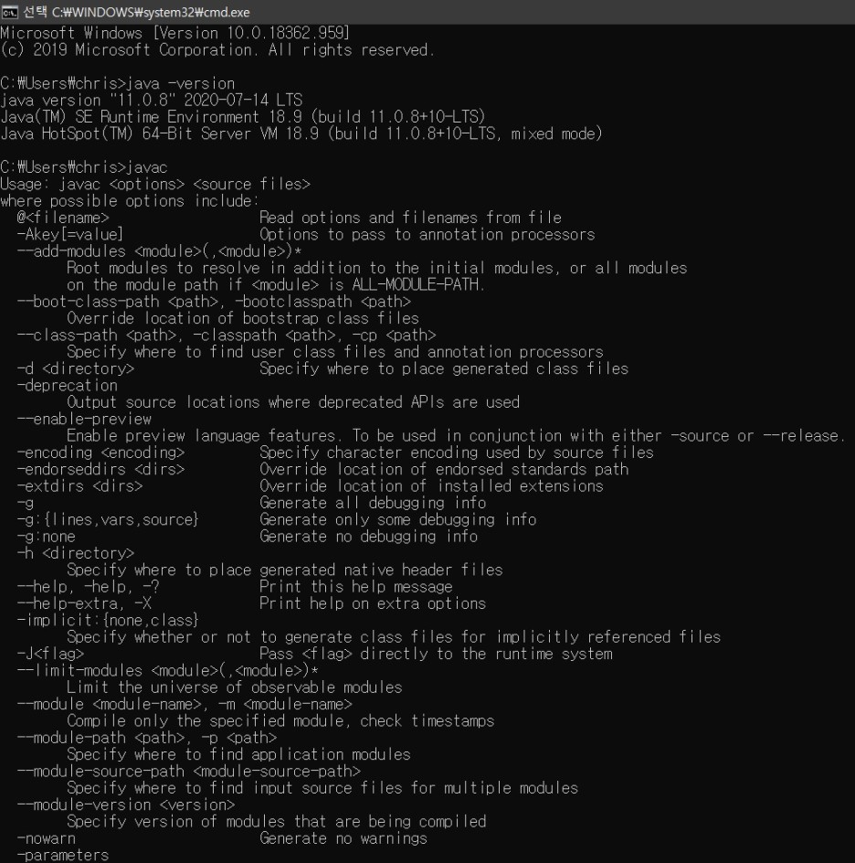 javac [옵션] [자바파일] : Java Compile의 약자, cmd창에서 java파일을 컴파일하여 실행시킬 수 있다.