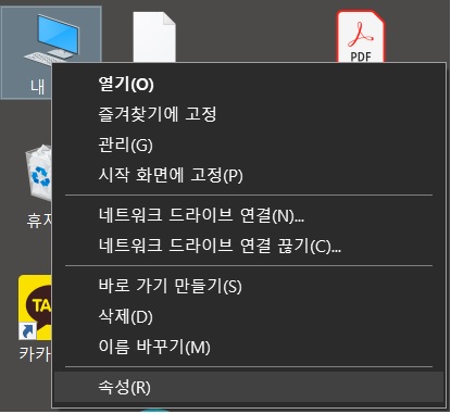 [내컴퓨터] - [우클릭] - [속성]에 들어갑니다.