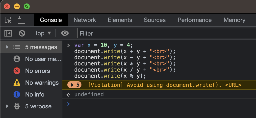 document.write(x * y + "<br>");