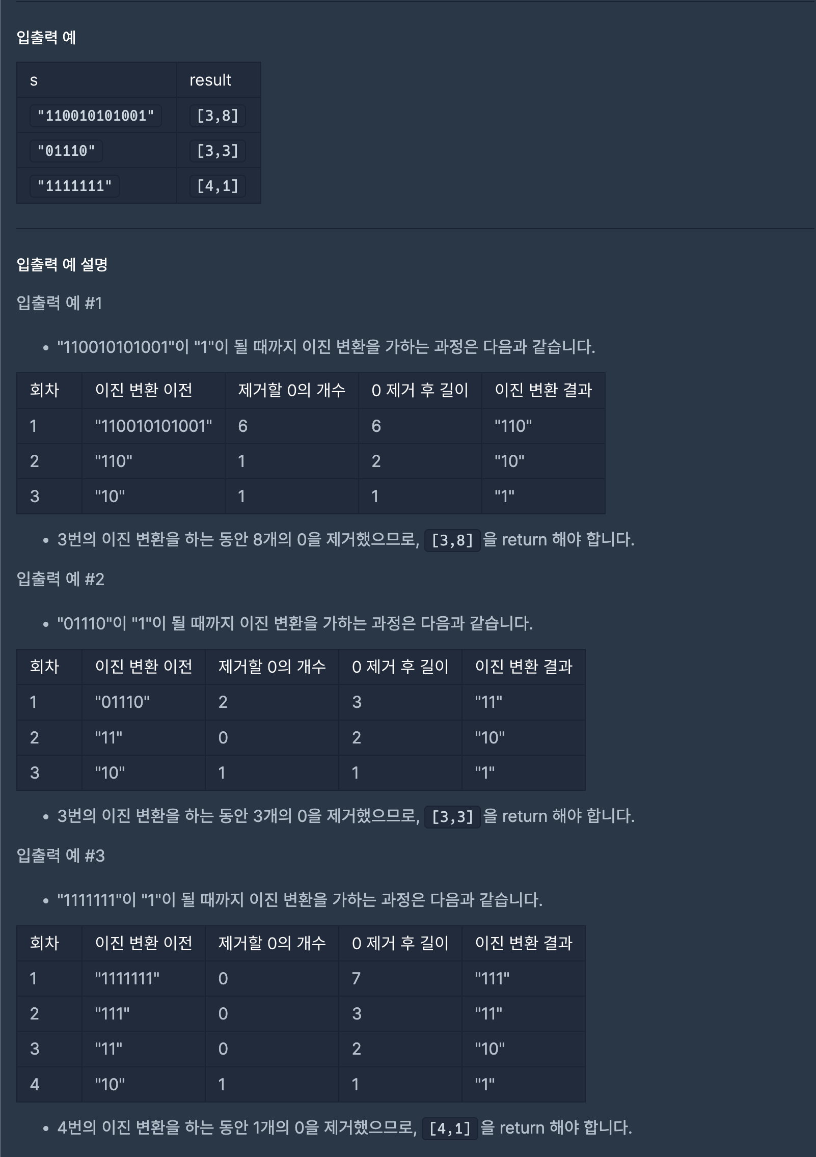 예를 들어, x = "0111010"이라면, x에 이진 변환을 가하면 x = "0111010" -> "1111" -> "100" 이 됩니다.