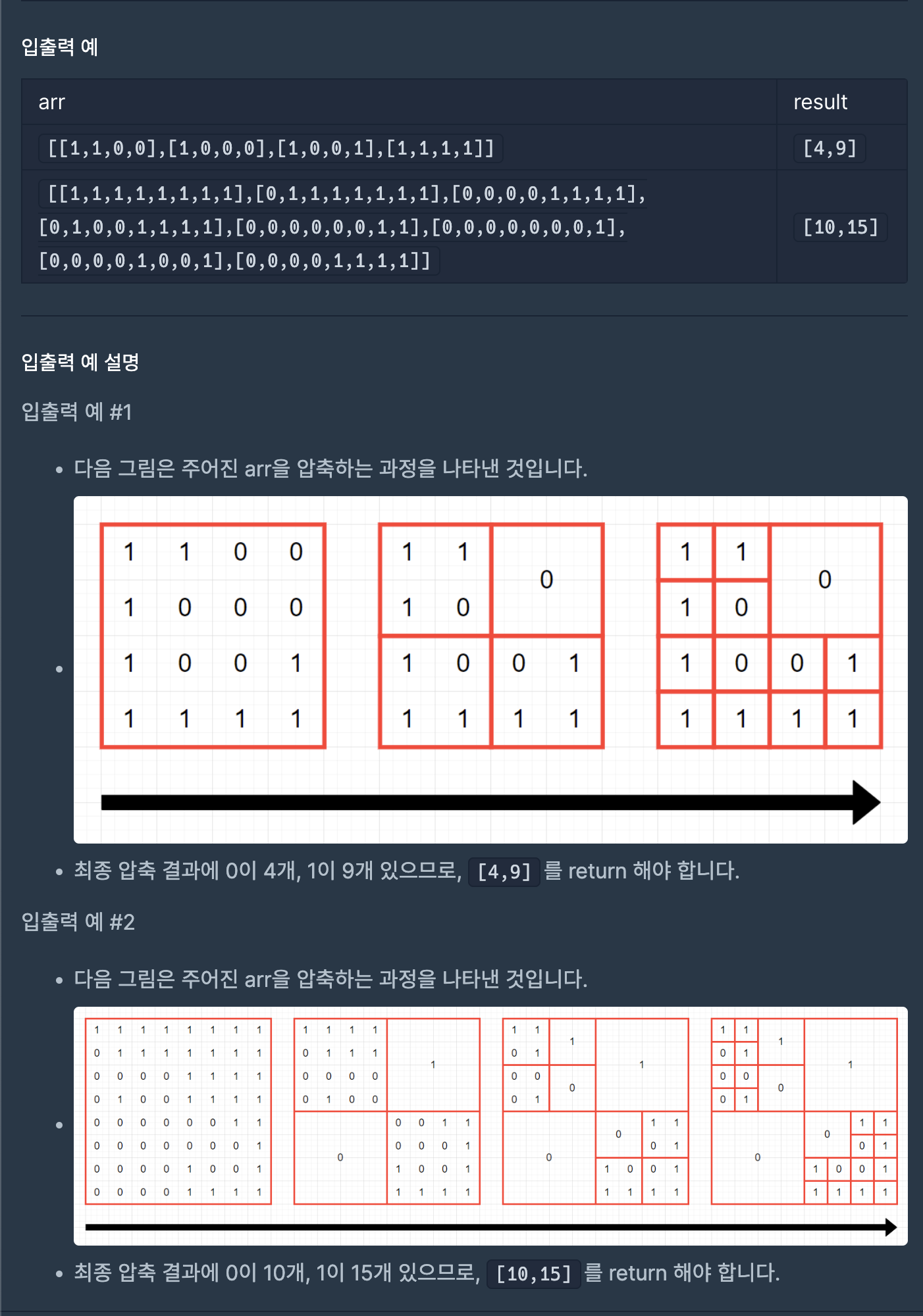 arr이 매개변수로 주어집니다. 위와 같은 방식으로 arr을 압축했을 때, 배열에 최종적으로 남는 0의 개수와 1의 개수를 배열에 담아서 return 하도록 solution 함수를 완성해 주세요.