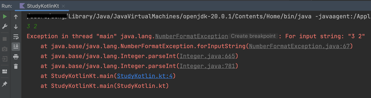 toInt(): String 클래스가 제공하는 메서드로, 메서드가 호출된 대상 문자열을 정숫값으로 변환한다.- 대상 문자열이 올바른 정숫값의 형태가 아니라면 toInt()는 런타임 오류를 내면서 프로그램을 종료시킨다.