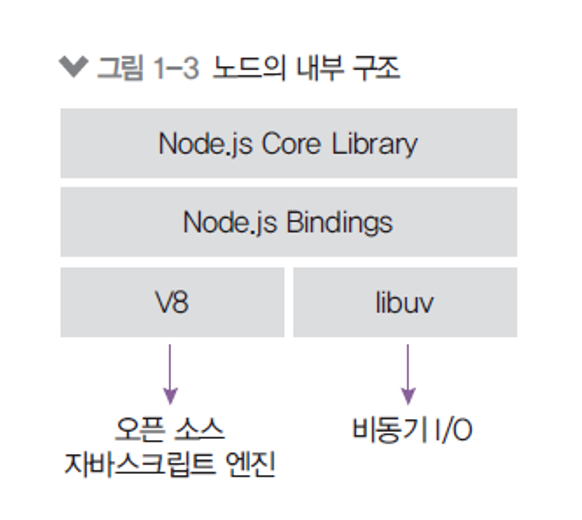 - 노드는 V8과 libuv를 내부적으로 포함하고 있다.