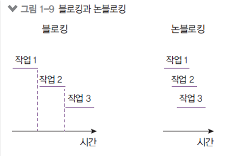 - 쉽게 말해, 블로킹 방식은 순차적으로 작업을 실행, 논블로킹은 작업 상태와 상관없이 동시에 진행이 가능하다.