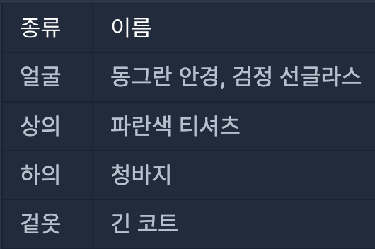 - clothes의 각 행은 [의상의 이름, 의상의 종류]로 이루어져 있습니다.