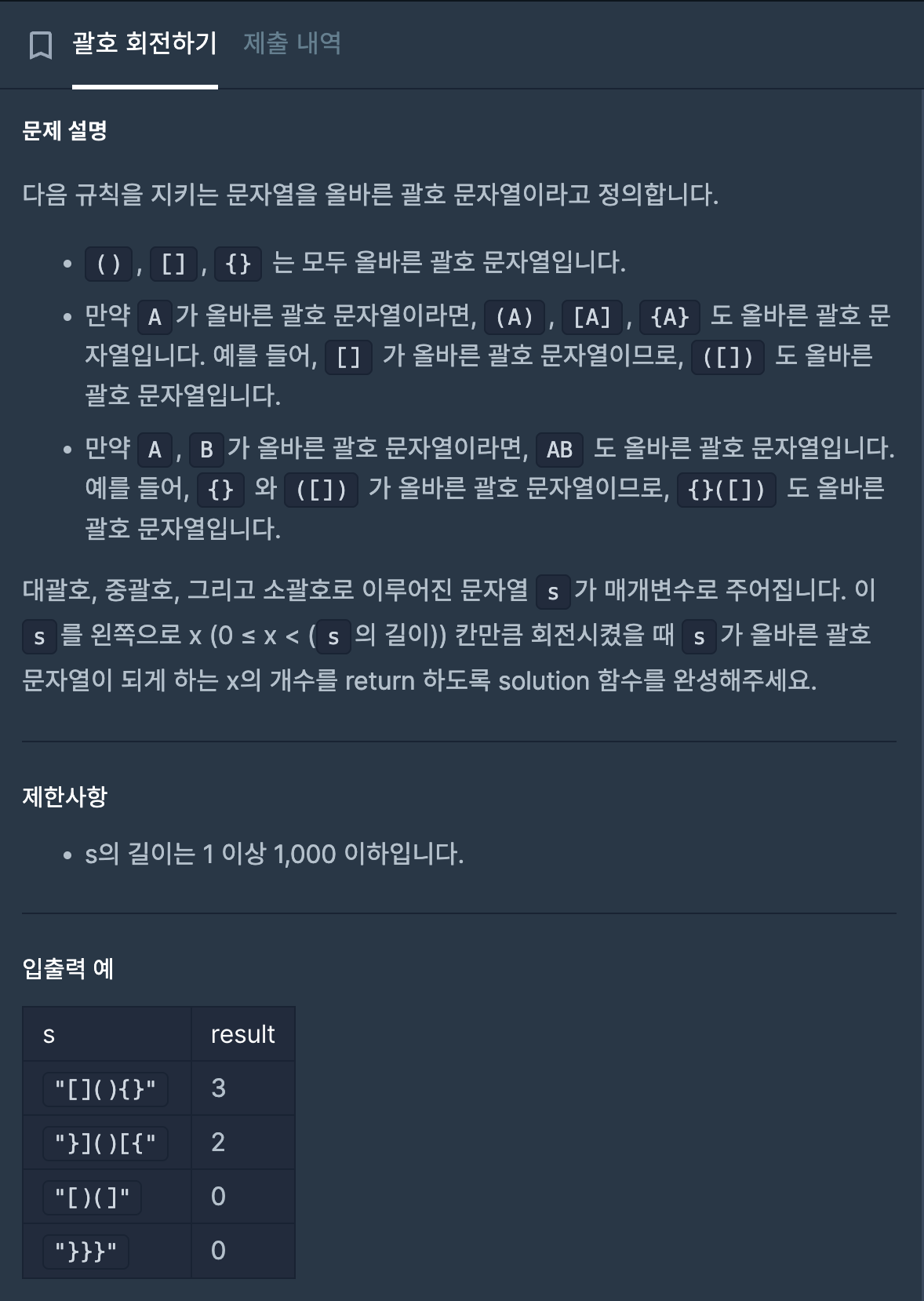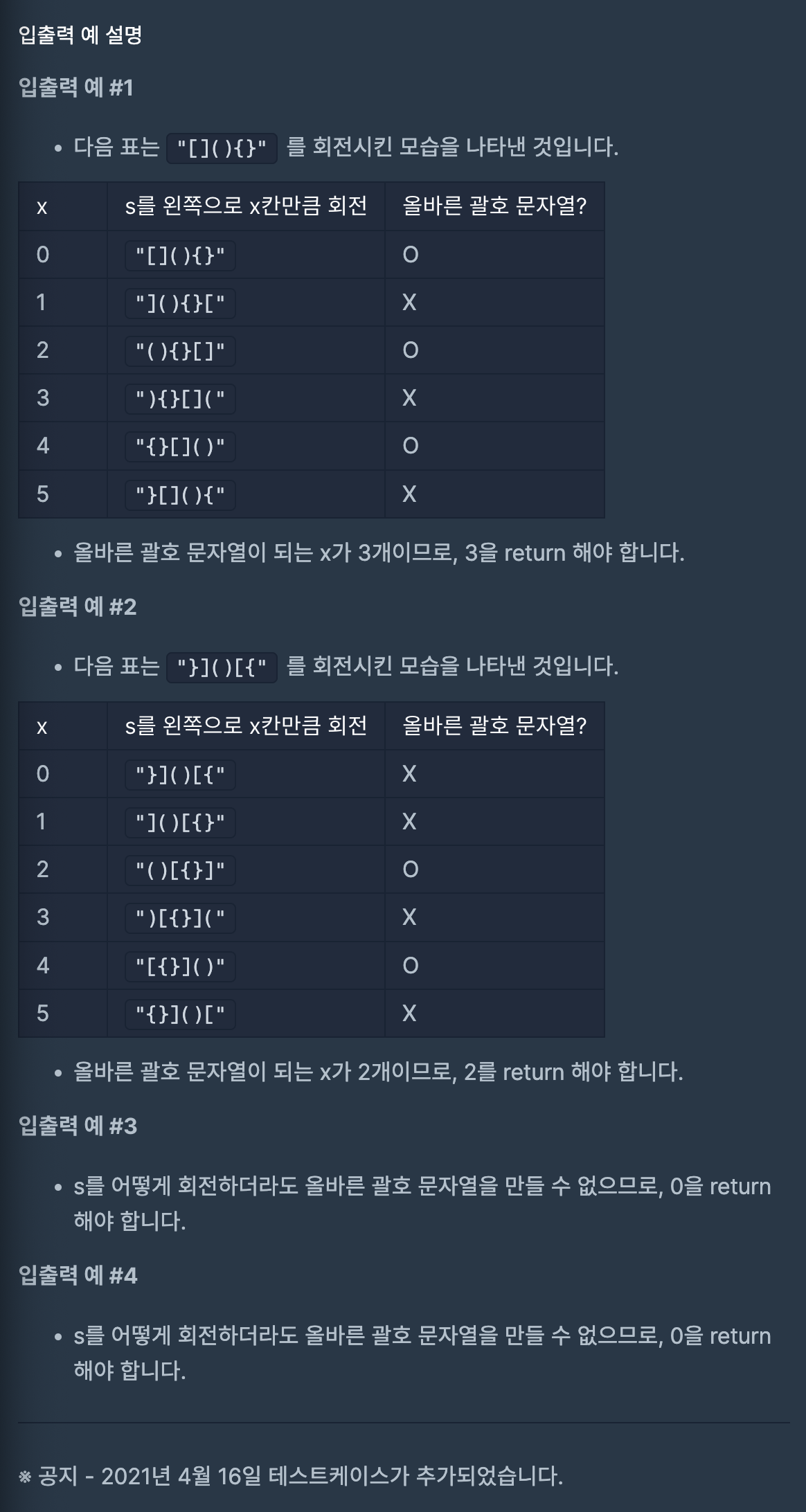 - 문제는 회전이라고 표현했는데 설명에서는 왼쪽으로 이동하고 맨 첫 번째에 있었던 괄호는 오른쪽 끝으로 이동한다.