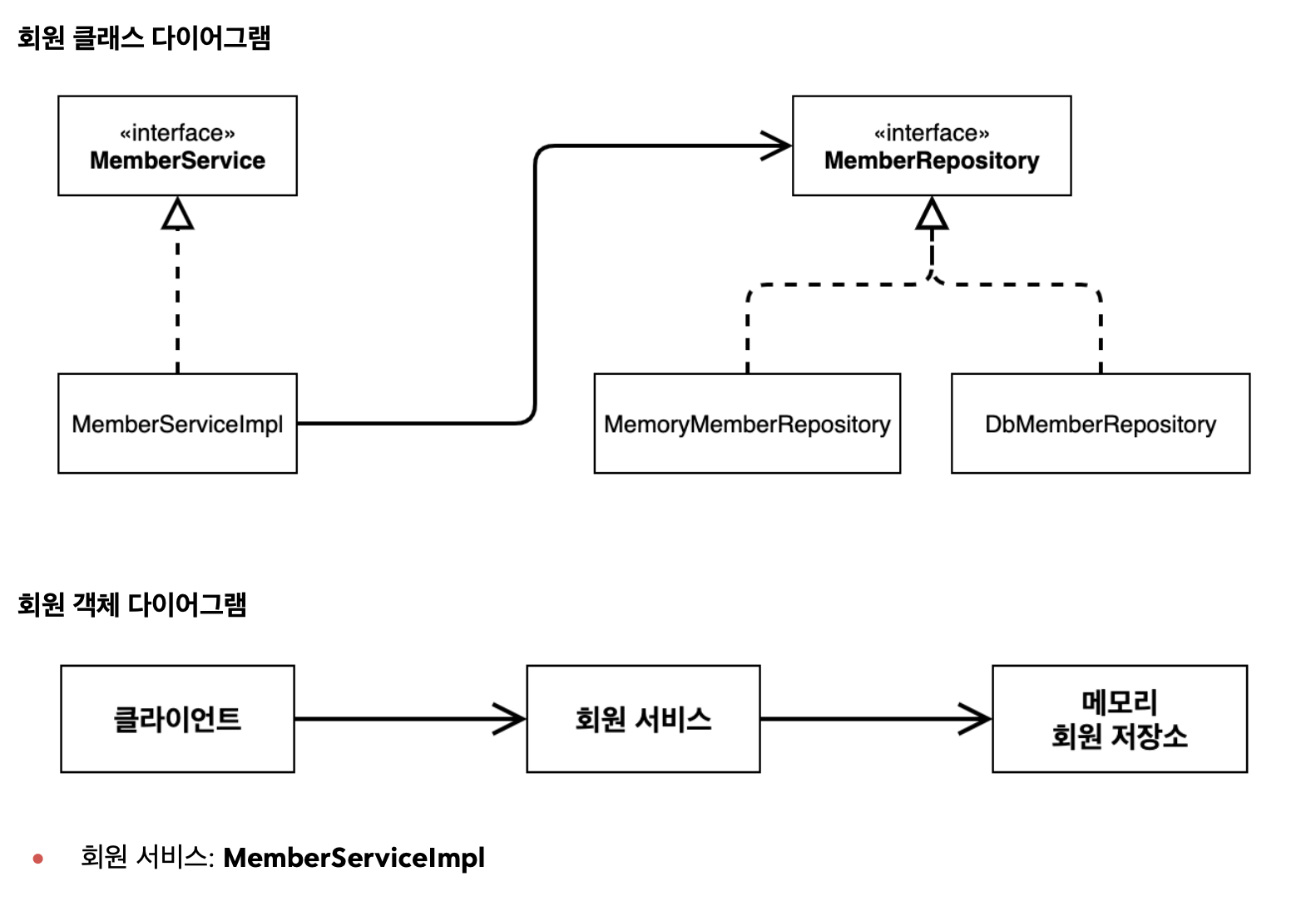 - MemberService 인터페이스의 규약에 따라 회원 가입과 회원 조회 기능을 가지고 있는 구현 클래스 생성
