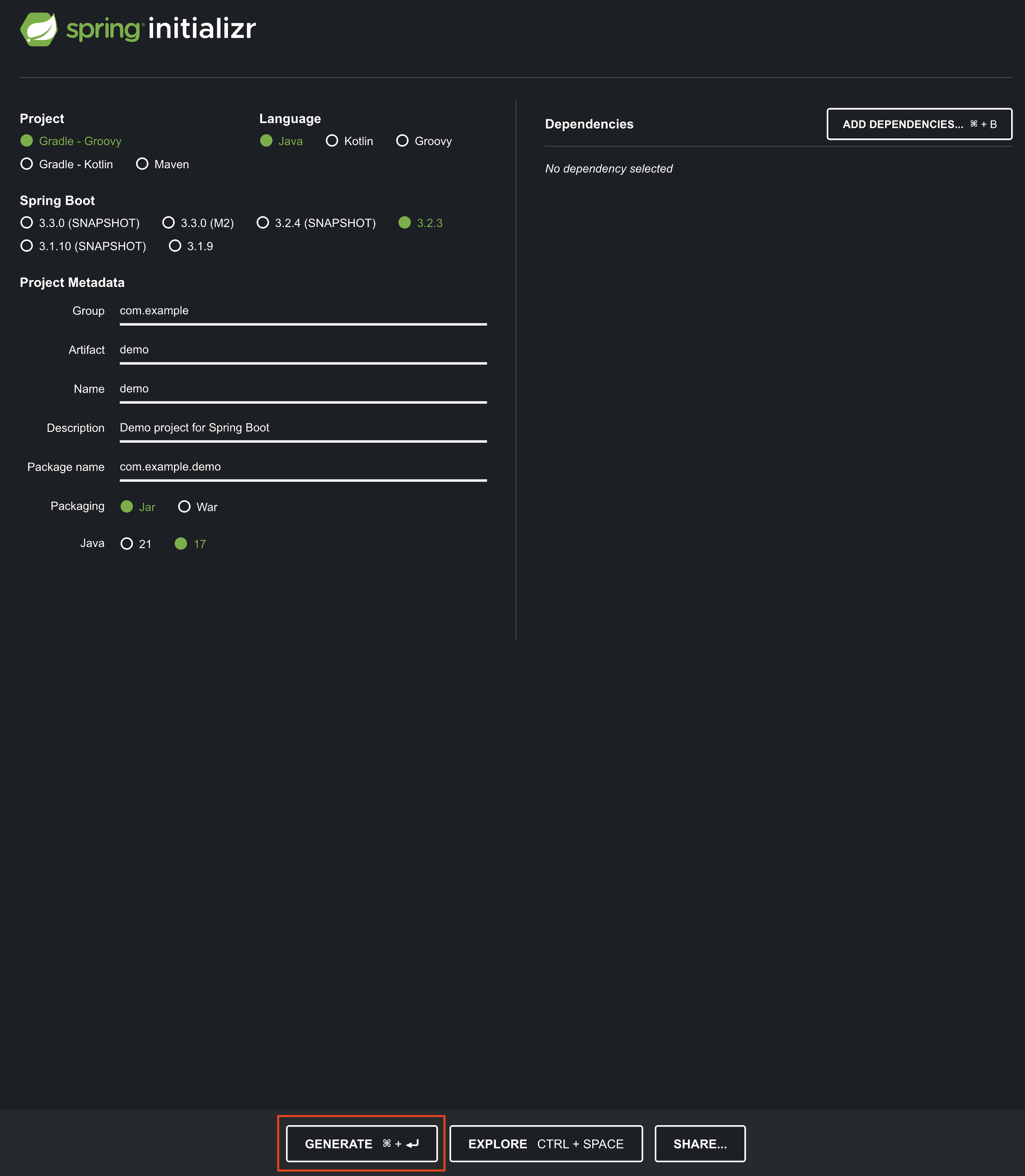 Java : 17 또는 21(오류의 최소화를 위해 17 버전 사용) - Project Metadata