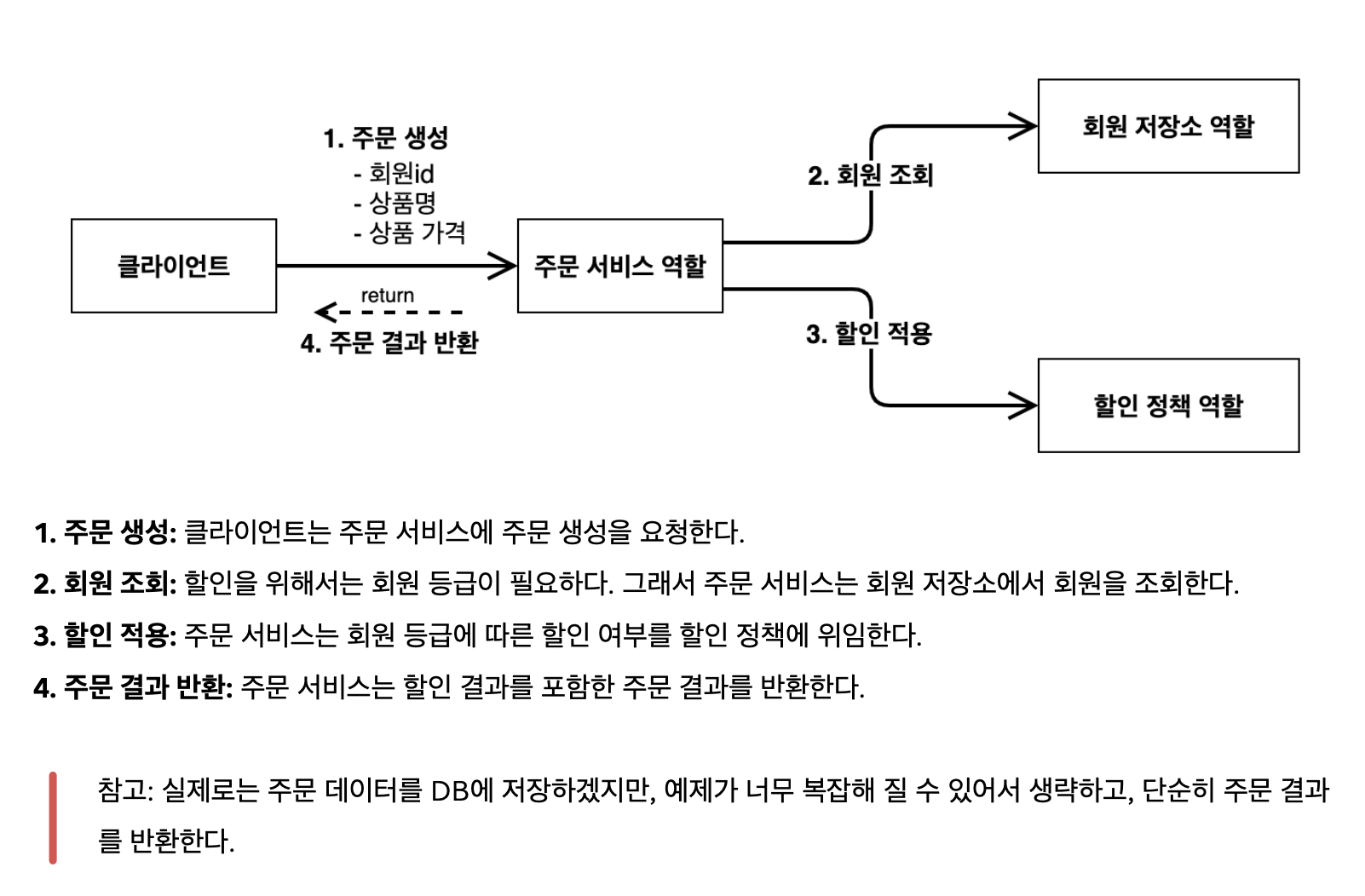 - 주문 서비스 구현체 MemberRepository 인터페이스를 구현한 MemoryMemberRepository 객체의 findById 메서드를 사용하여 회원 정보를 조회한다.