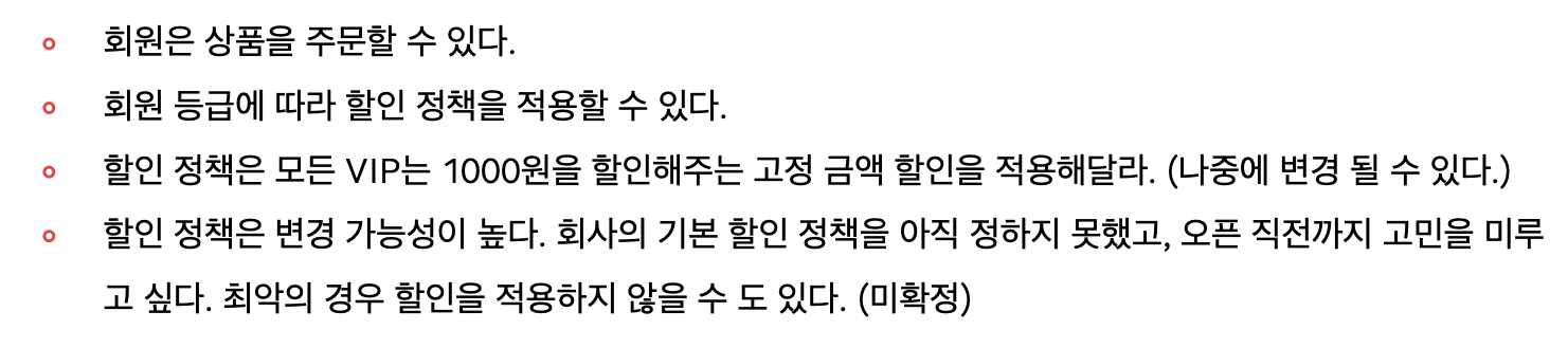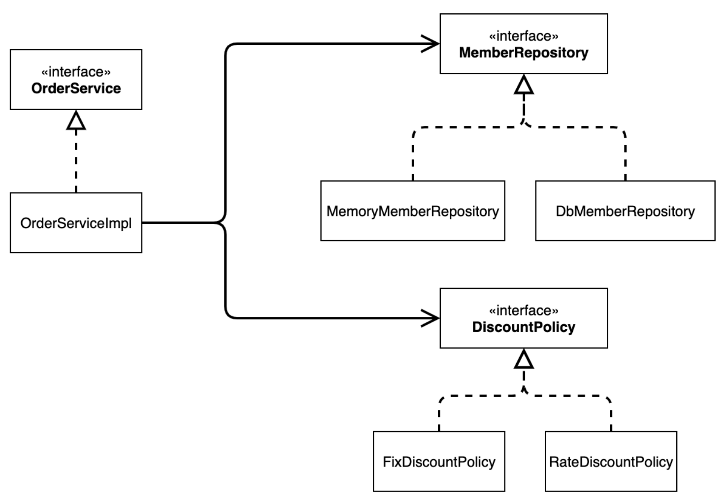- 다이어그램을 통해서 우리가 해야 할 일은 크게 주문 서비스 역할, 회원 저장소 역할, 할인 정책 역할이라는 인터페이스를 만들고, 각 인터페이스에 해당하는 서비스 구현체를 만드는 것이다.