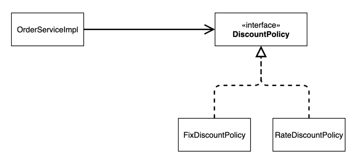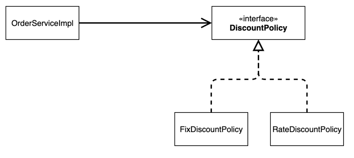 - 설계 변경으로 OrderServiceImpl 은 FixDiscountPolicy를 의존하지 않고, DiscountPolicy 인터페이스만 의존한다.