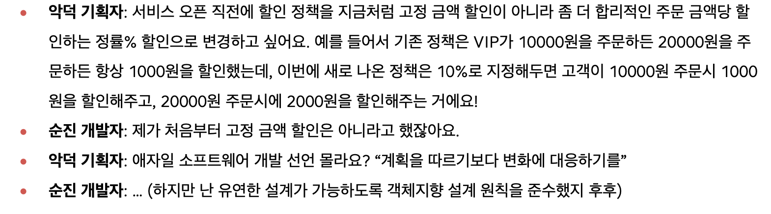 (개인적으로 이렇게 예시를 들어가며 말해주는 기획자는 악덕까지는 아닌 듯하다.) - 전에 사용했던 FixDiscountPolicy 객체에 이어, 할인 정책이 바뀐다는 상황을 고려하여 RateDiscountPolicy라는 객체를 새로 만들어주었다.