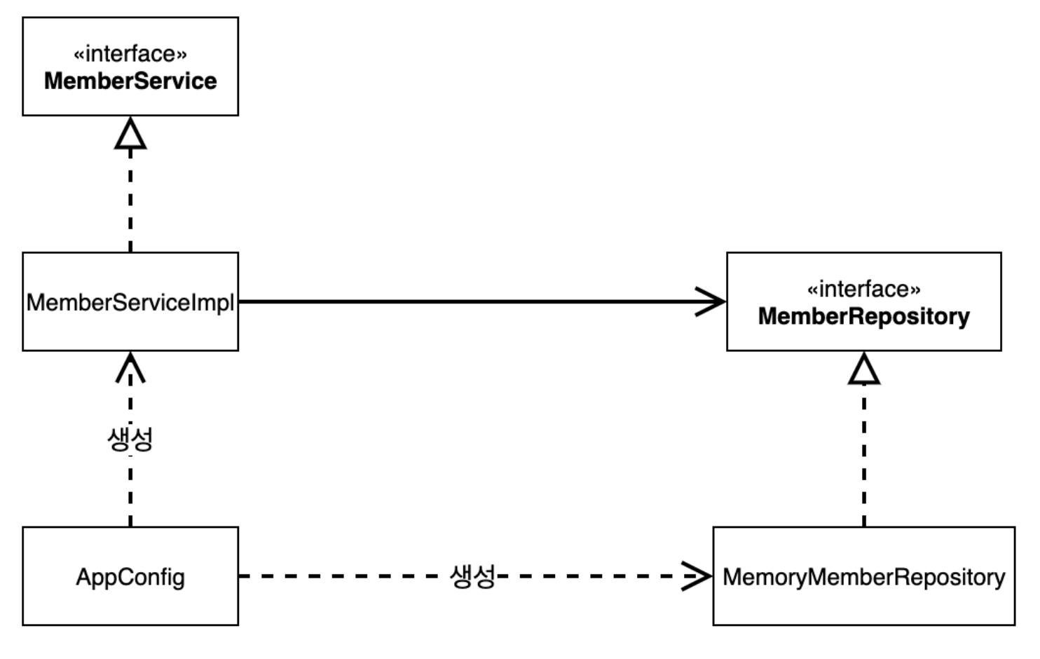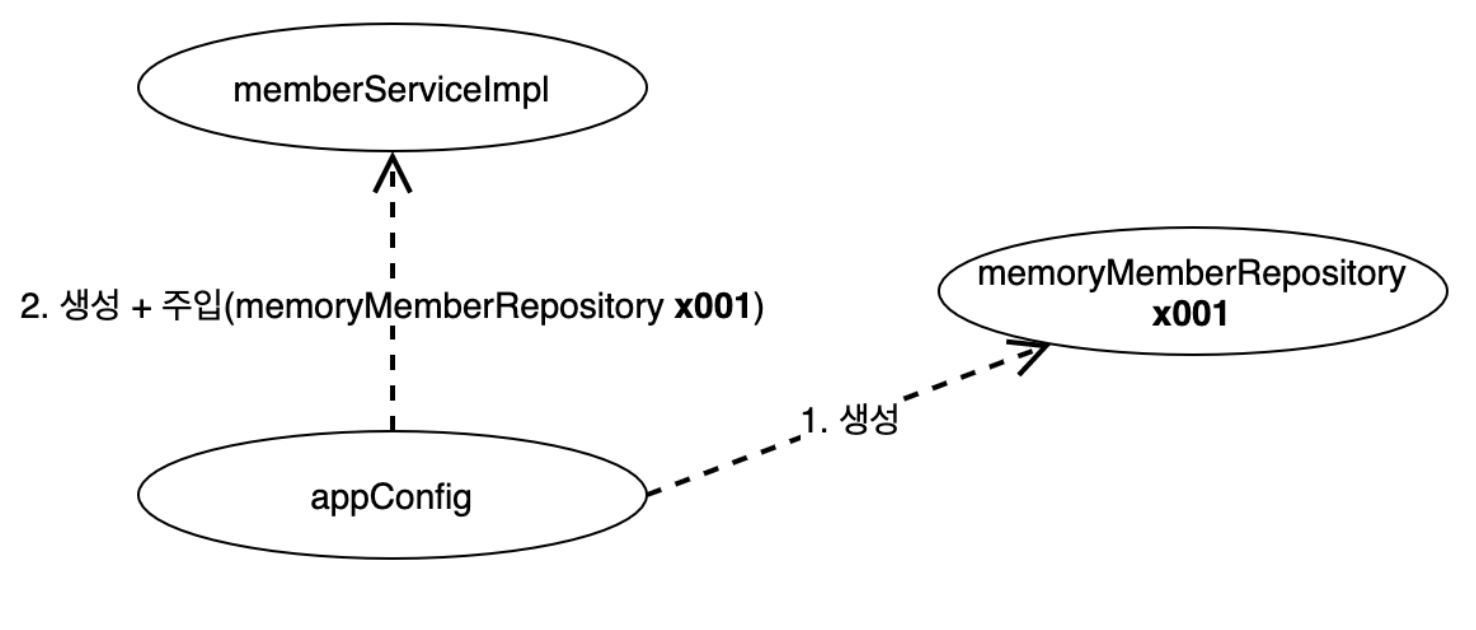 - appConfig 객체는 memoryMemberRepository 객체를 생성하고, 그 참조값(x001) memberServiceImpl을 생성하면서 생성자로 전달한다.