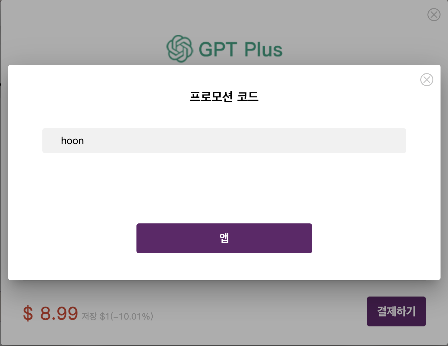 이렇게 프로모션 코드(hoon)를 입력하면,