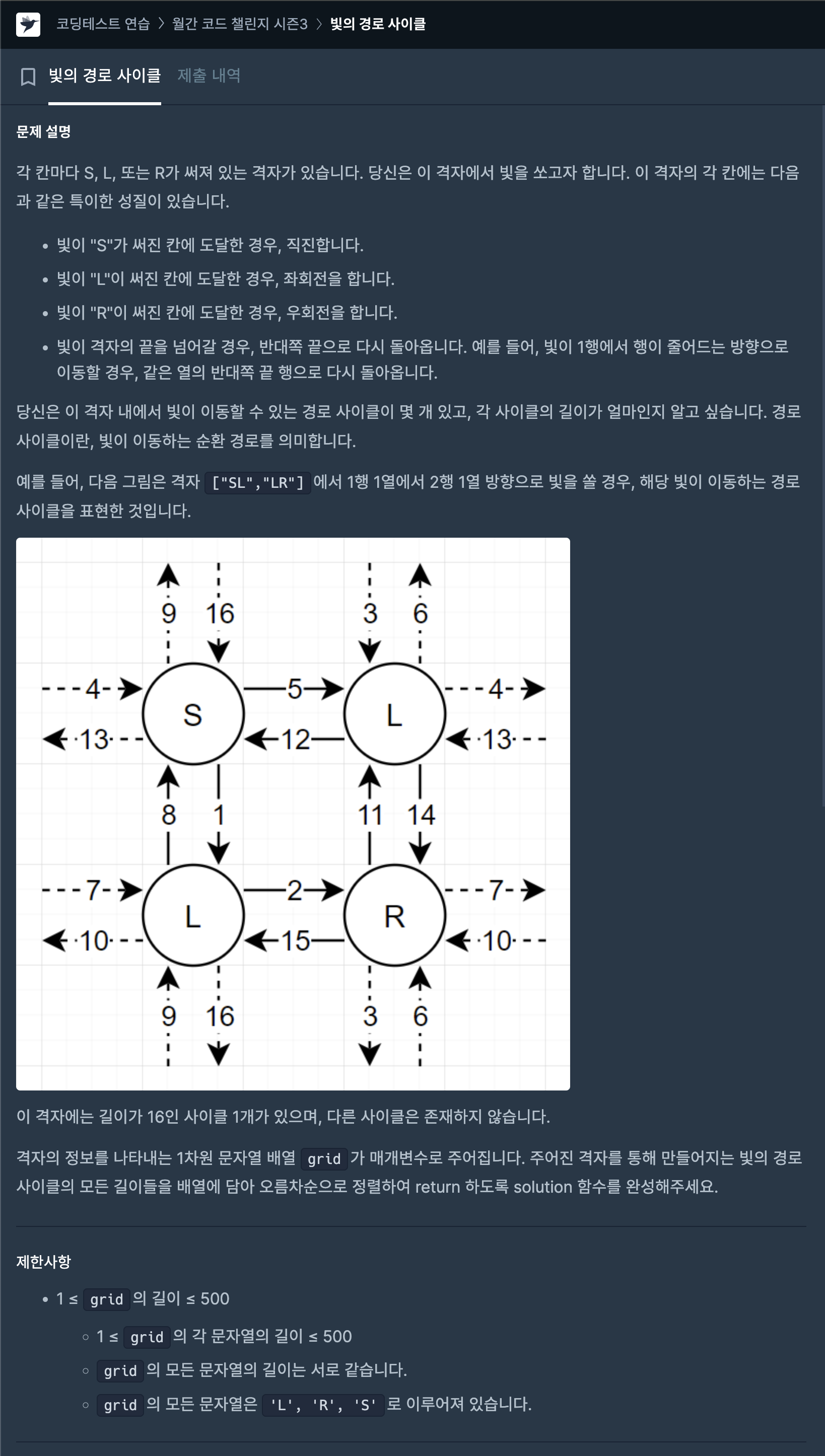 - 이동 경로상에서 빛이 'L' 또는 'R' 칸에 도달할 때마다 방향을 조정하고, 그리드의 경계에 도달하면 반대편으로 이동.