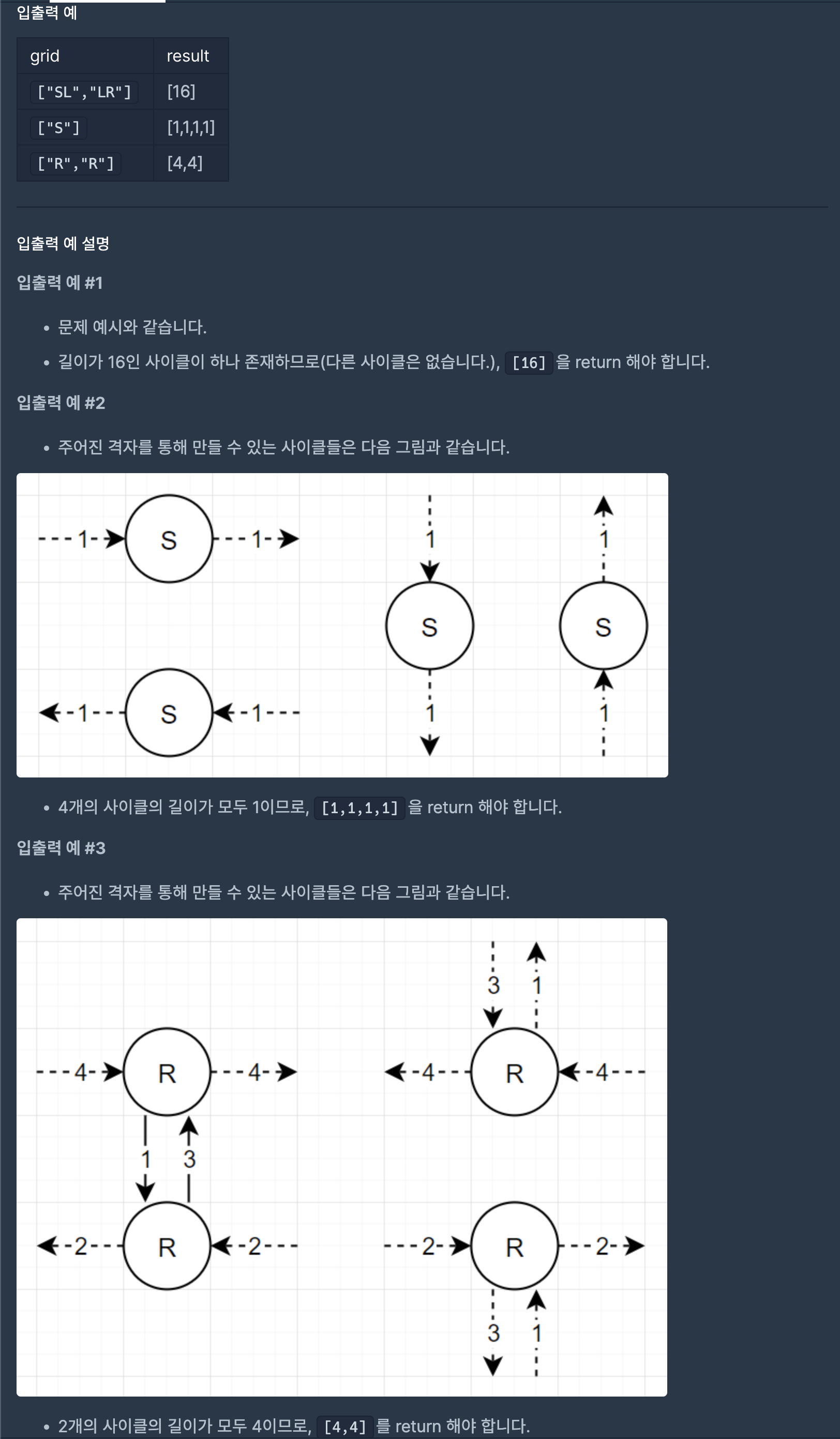 - 사이클을 판단하는 방법은 같은 좌표를 같은 진행방향으로 재방문한 경우이다.