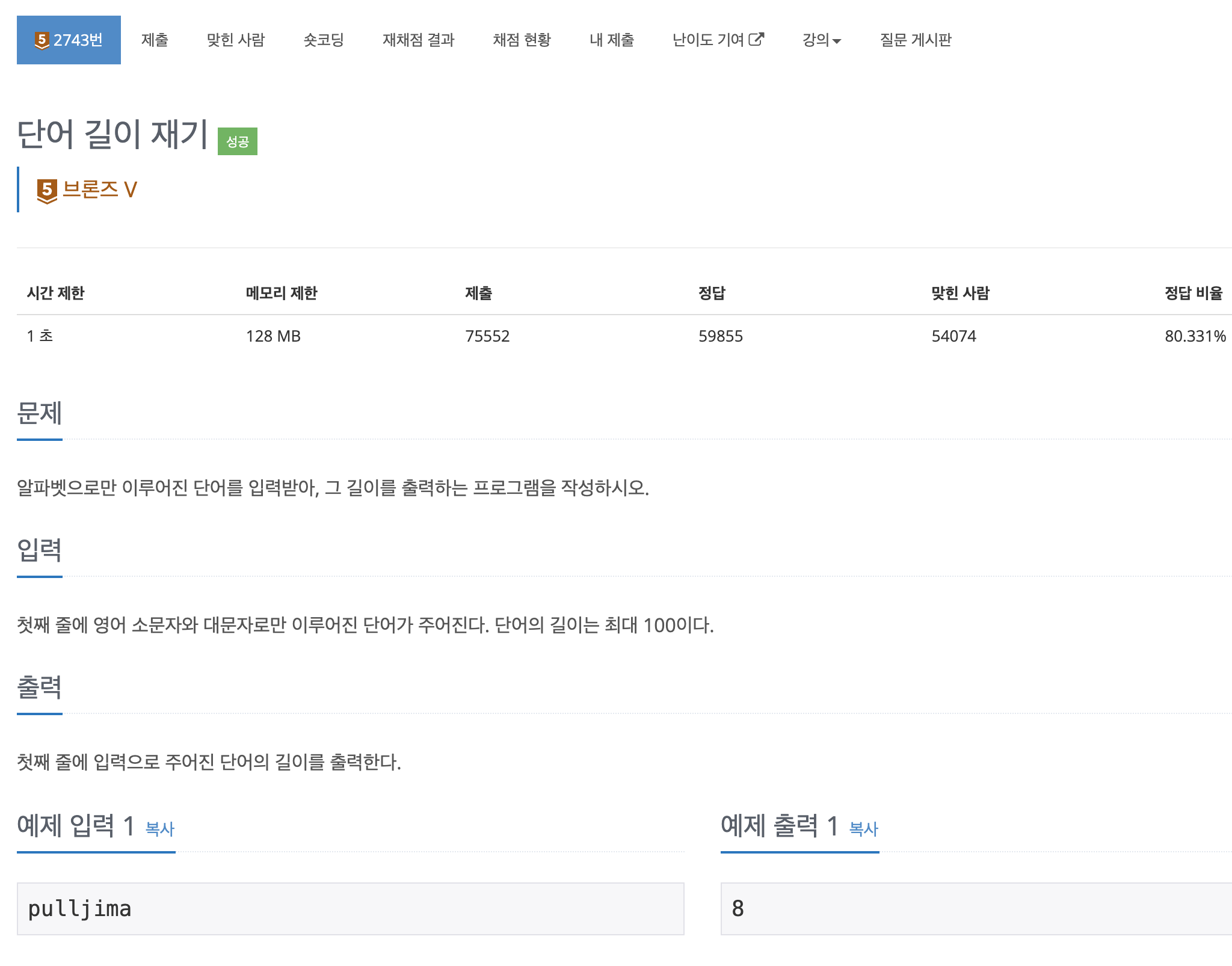 백준 27866 2743 Java Javascript 문자와 문자열 단어 길이 재기 본문