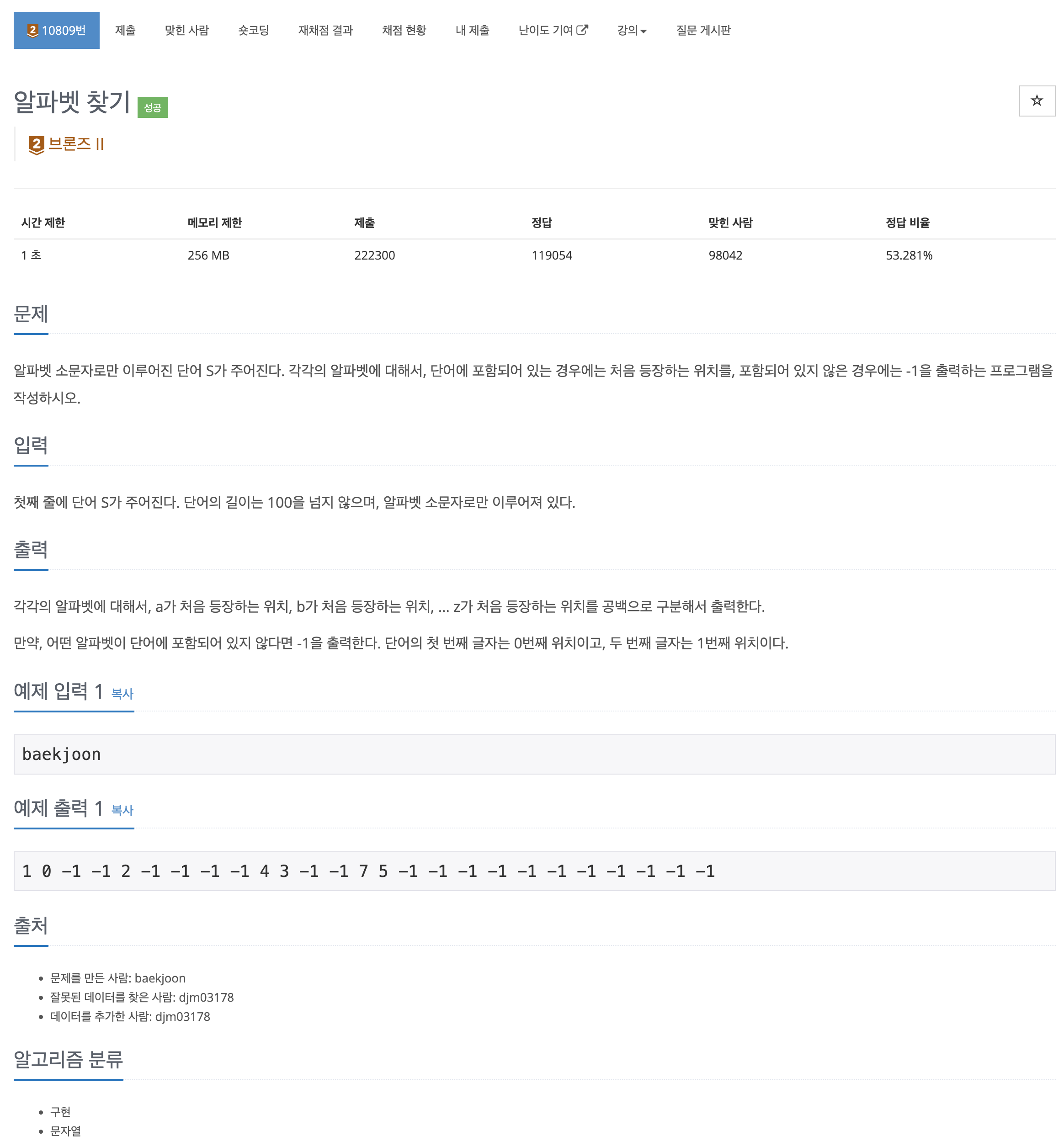 - line 11 : 해당 문자가 아직 문자열에서 발견되지 않았음을 나타내기 위해 -1로 초기화