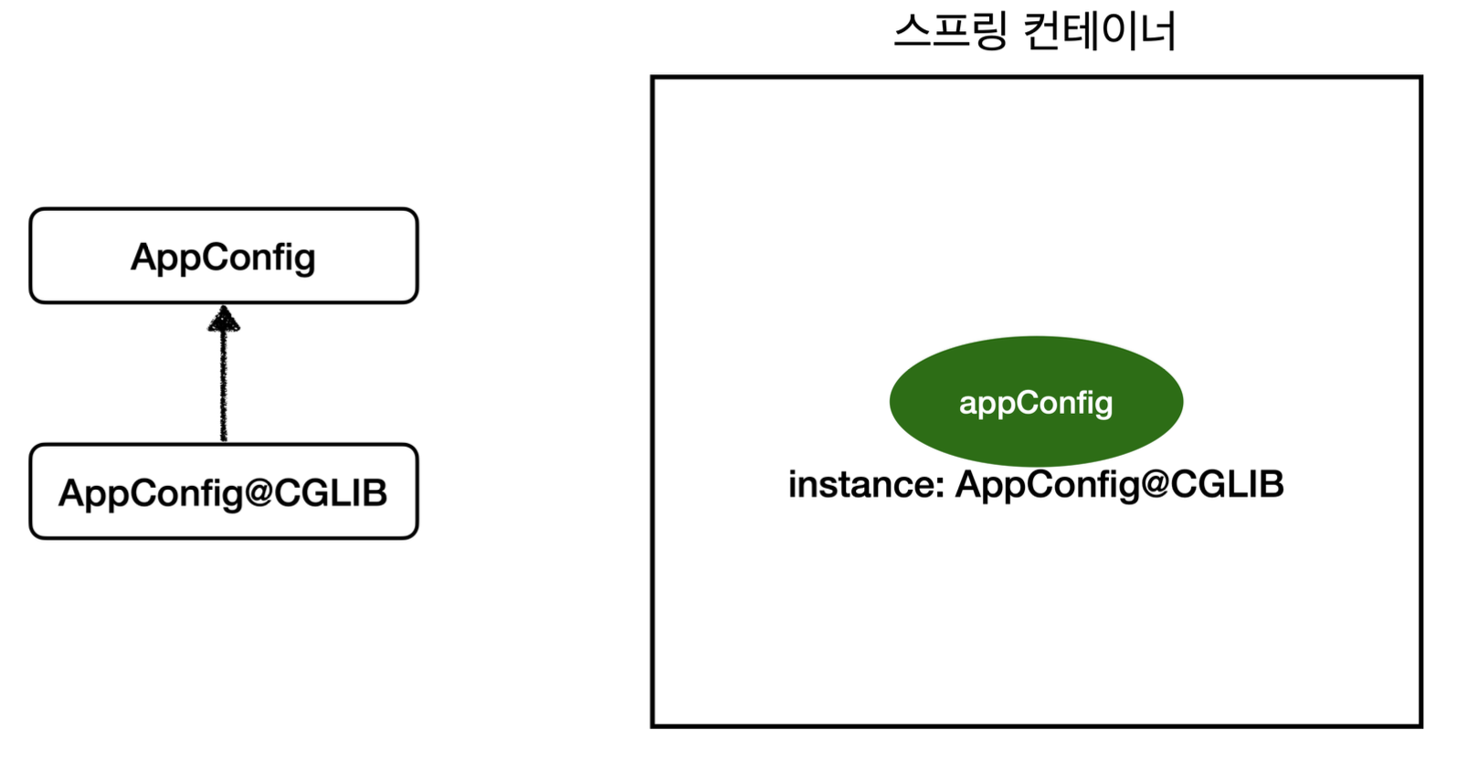 - 이것은 내가 만든 클래스가 아니라 스프링이 CGLIB라는 바이트코드 조작 라이브러리를 사용해서 AppConfig 클래스를 상속받은 임의의 다른 클래스를 만들고, 그 다른 클래스를 스프링 빈으로 등록한 것이다!