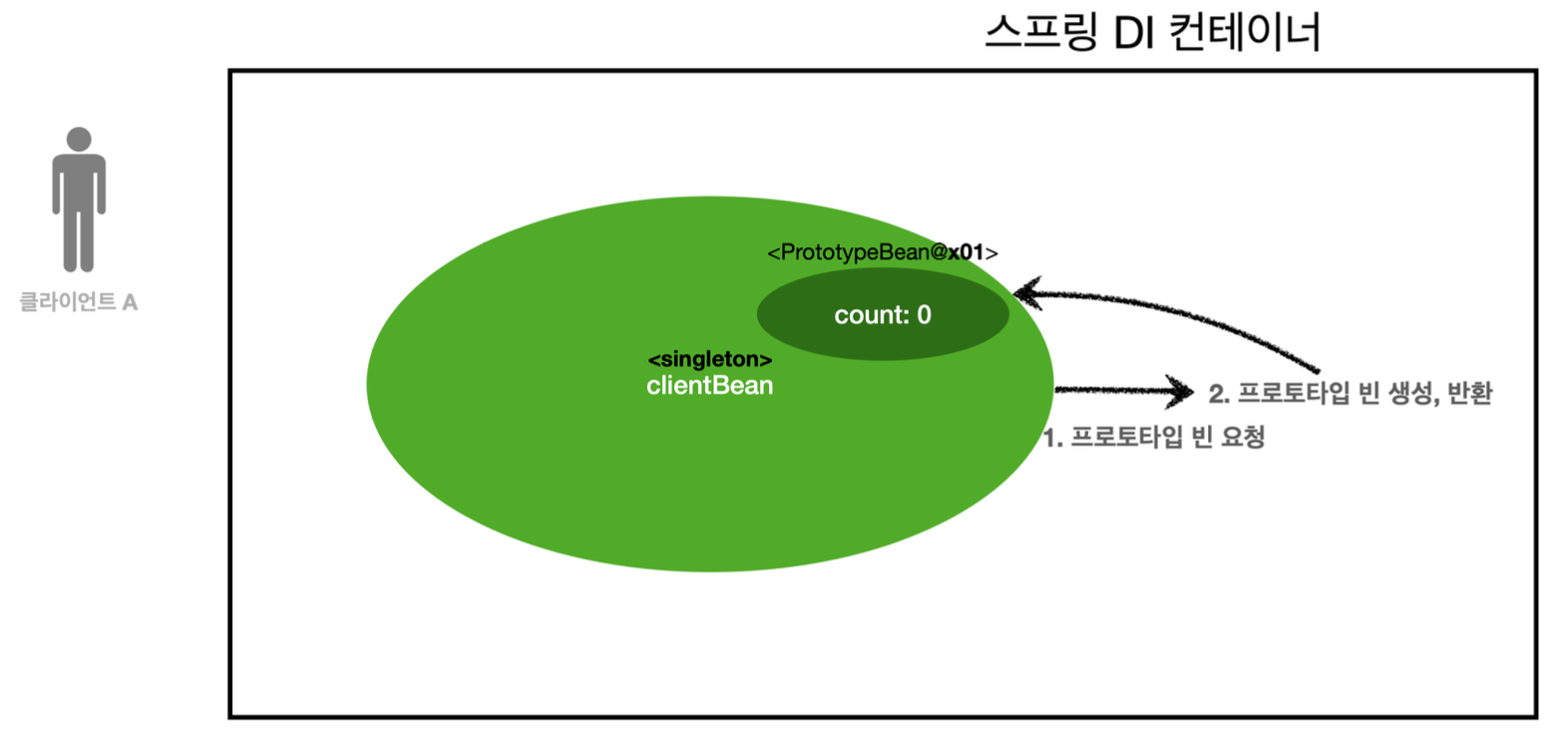 - 스프링 컨테이너는 프로토타입 빈을 생성해서 `clientBean` 에 반환한다. 프로토타입 빈의 count 필드 값은 0