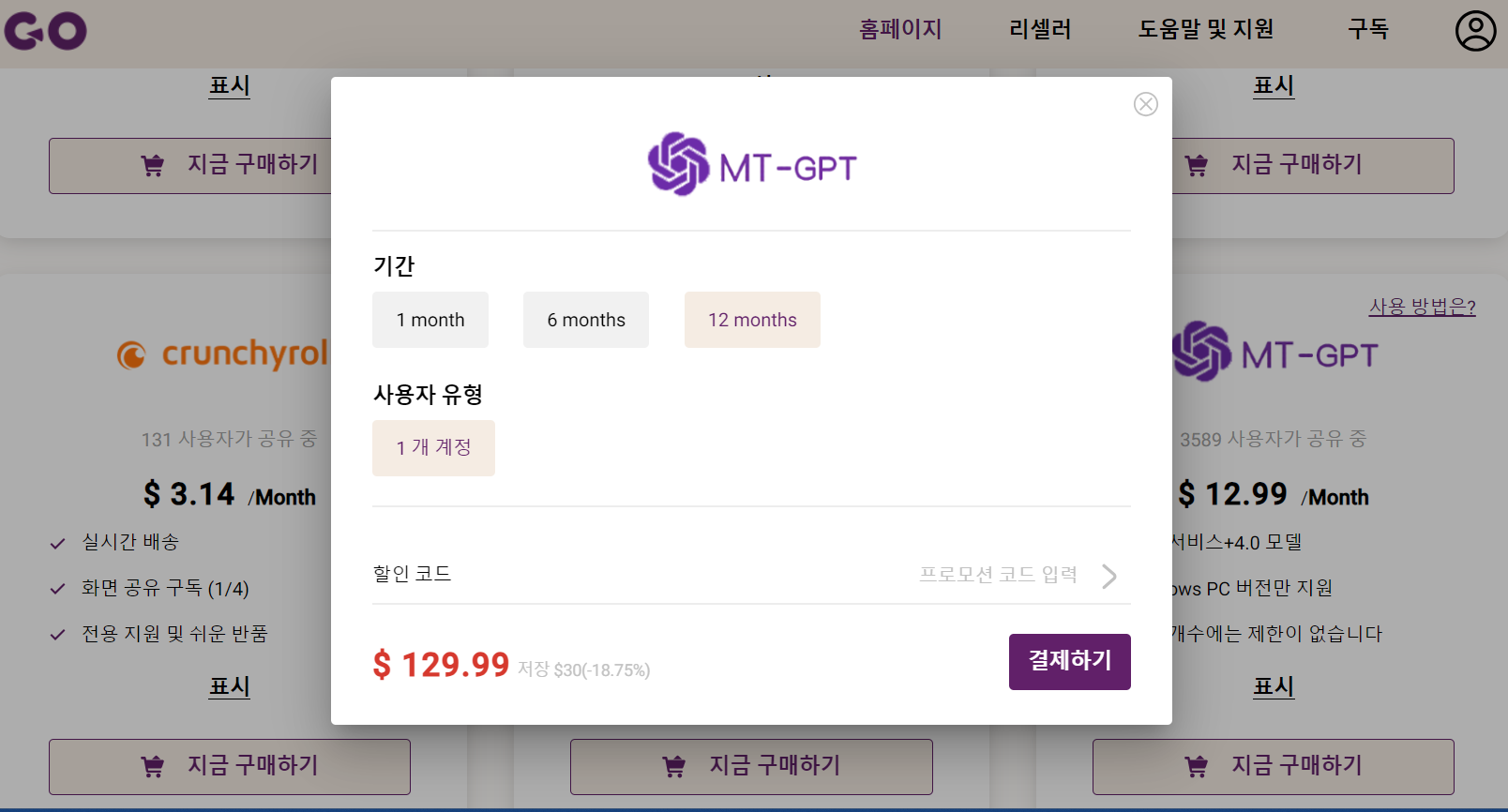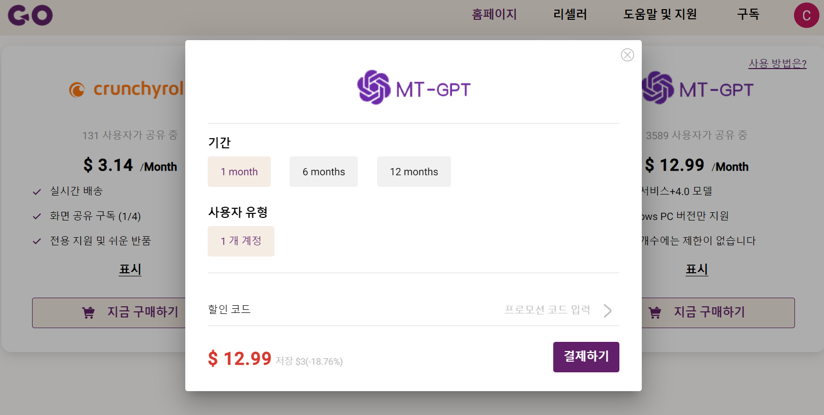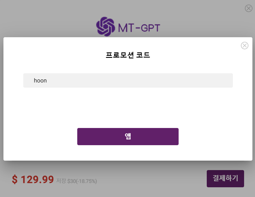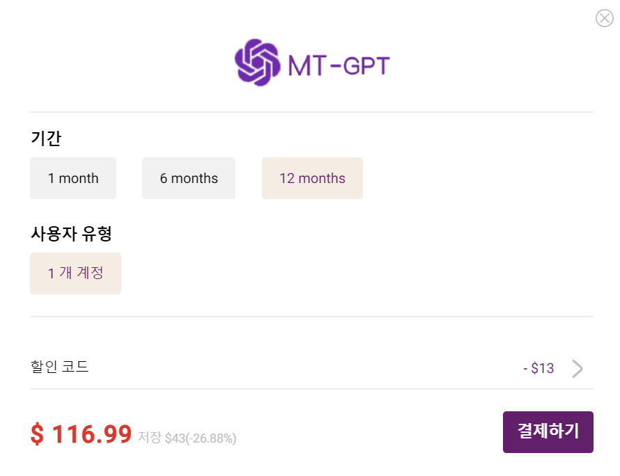 MT-GPT 한 달은 12.99 달러, 1년은 129.99 달러.