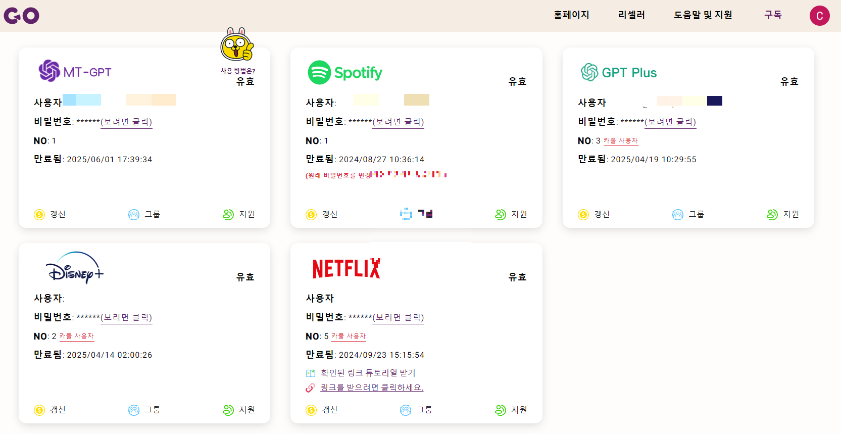 결제가 완료되면, 페이지 우측상단 구독 페이지에서 내가 구독한 고잉버스 서비스들을 확인할 수 있다.
