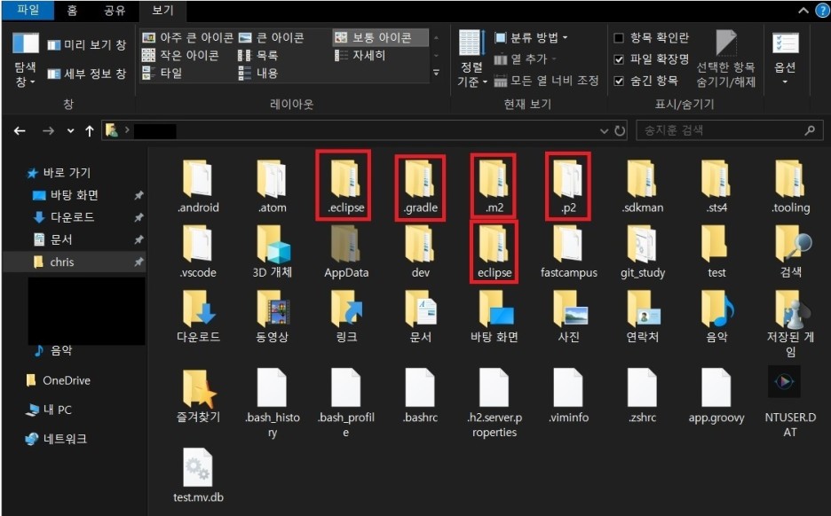 최초에 eclipse가 설치된 경로를 찾아서 [보기]-[숨긴항목] 을 체크 후,