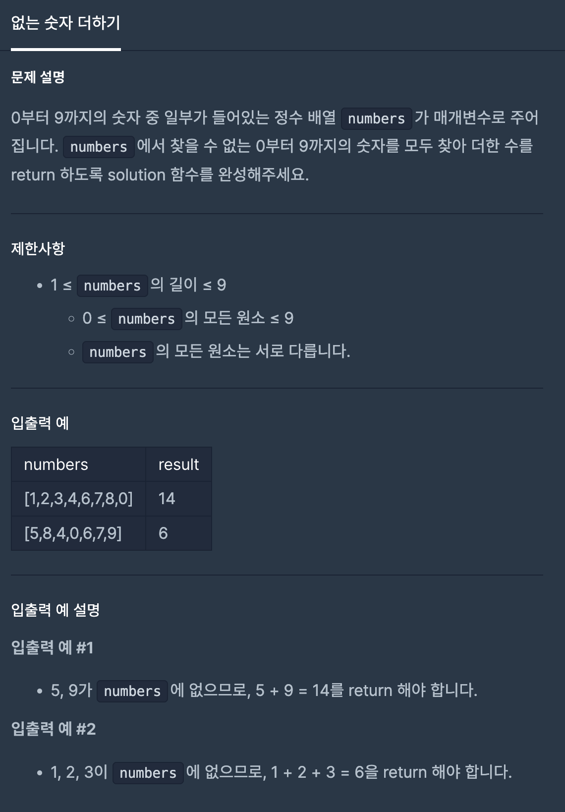 문제출처 : https://programmers.co.kr/learn/courses/30/lessons/86051