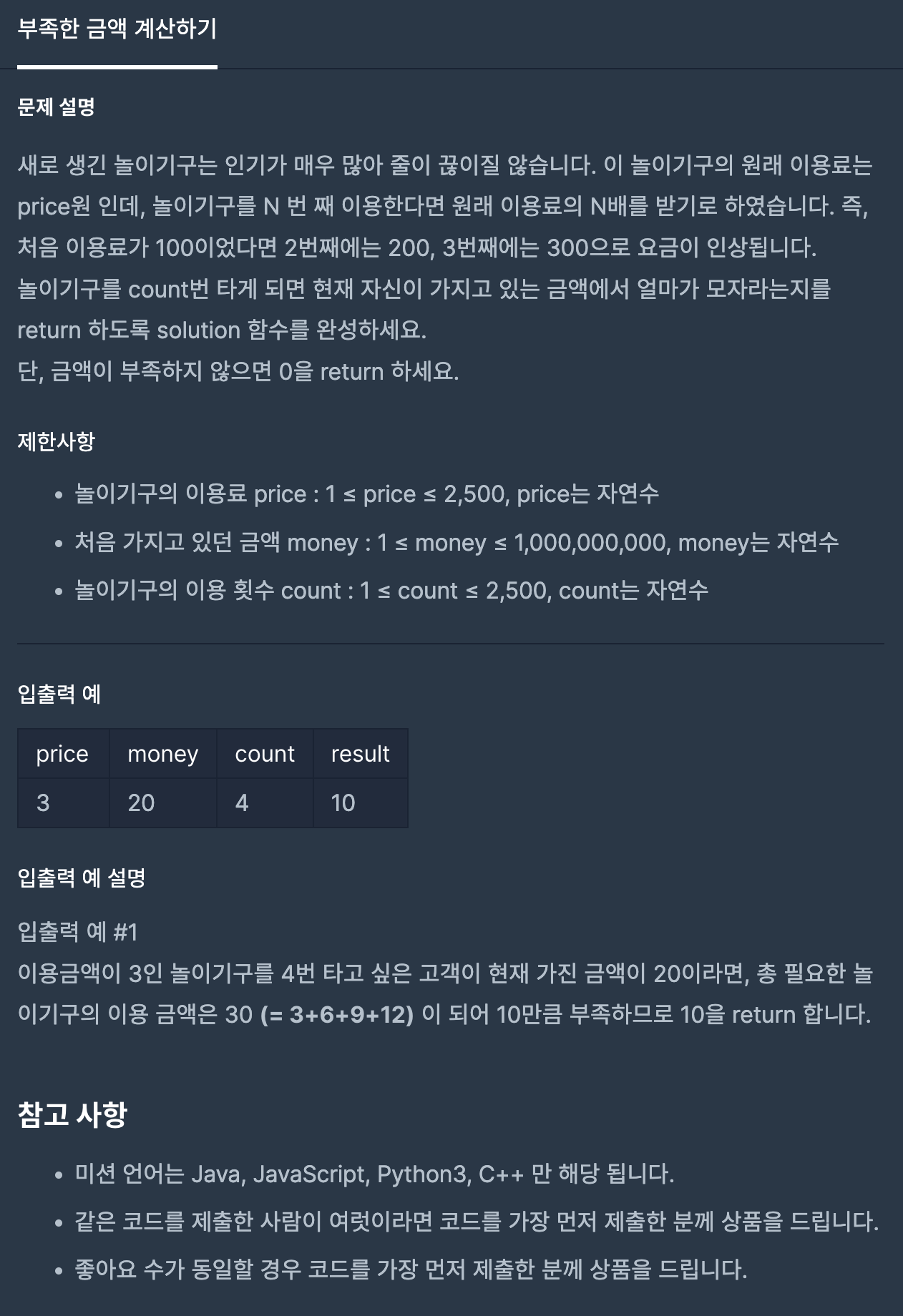 코딩테스트 연습 - 부족한 금액 계산하기