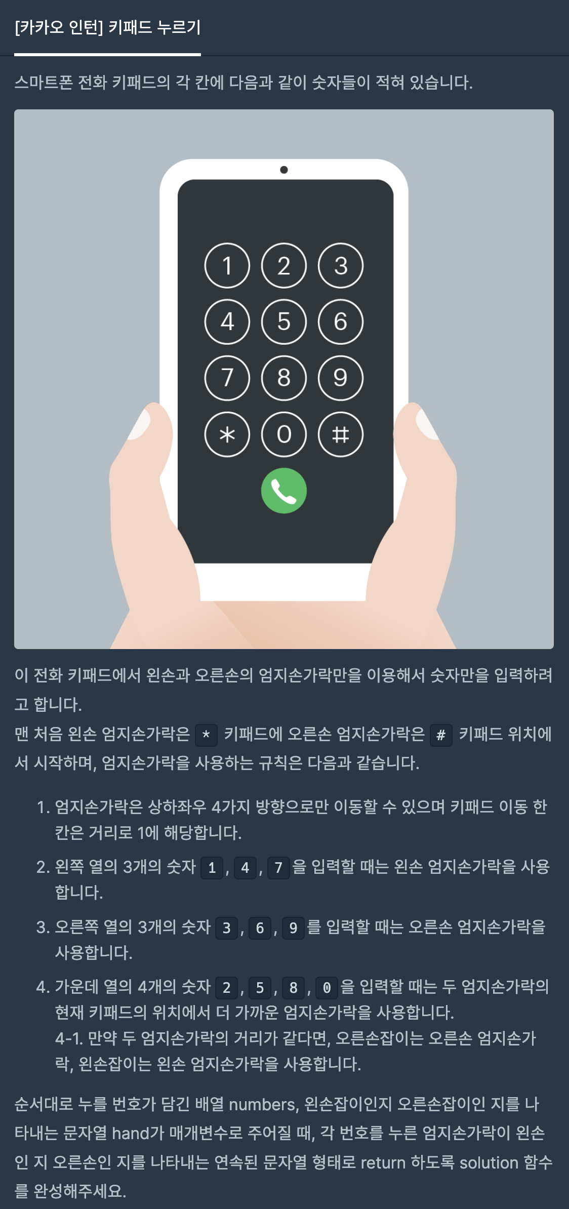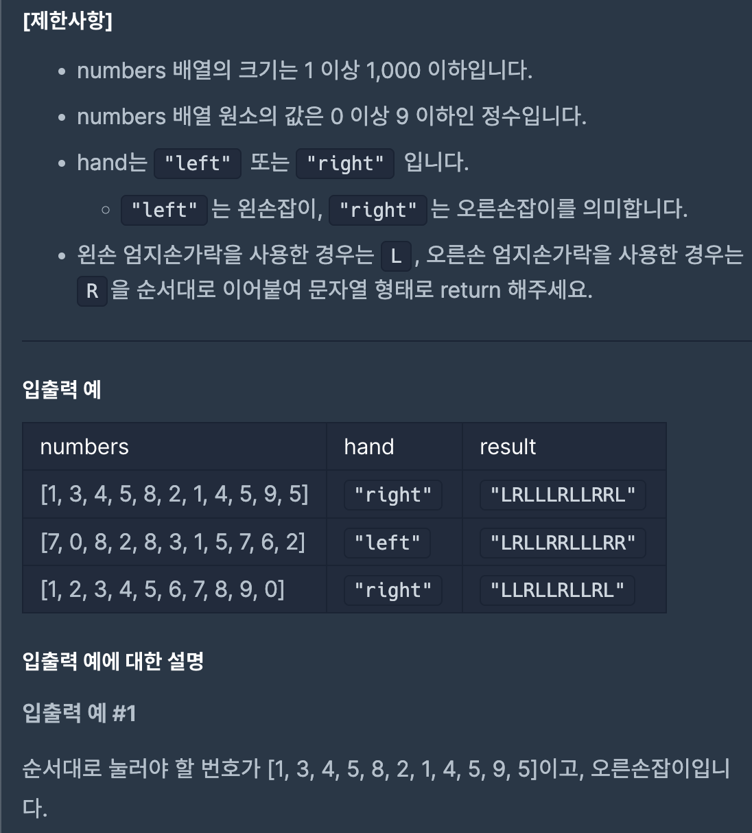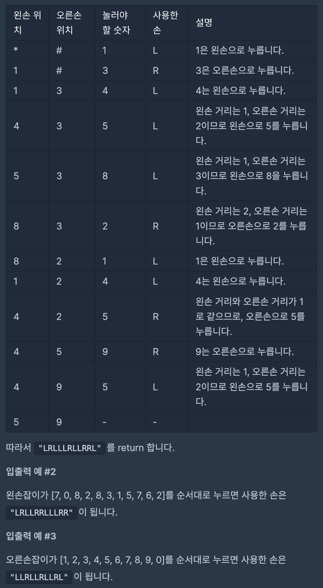 - 핵심은 눌러야 할 버튼의 거리계산, 가운데 줄 버튼 시 조건, 주 사용손에 따른 조건을 나누는 것이 관건!