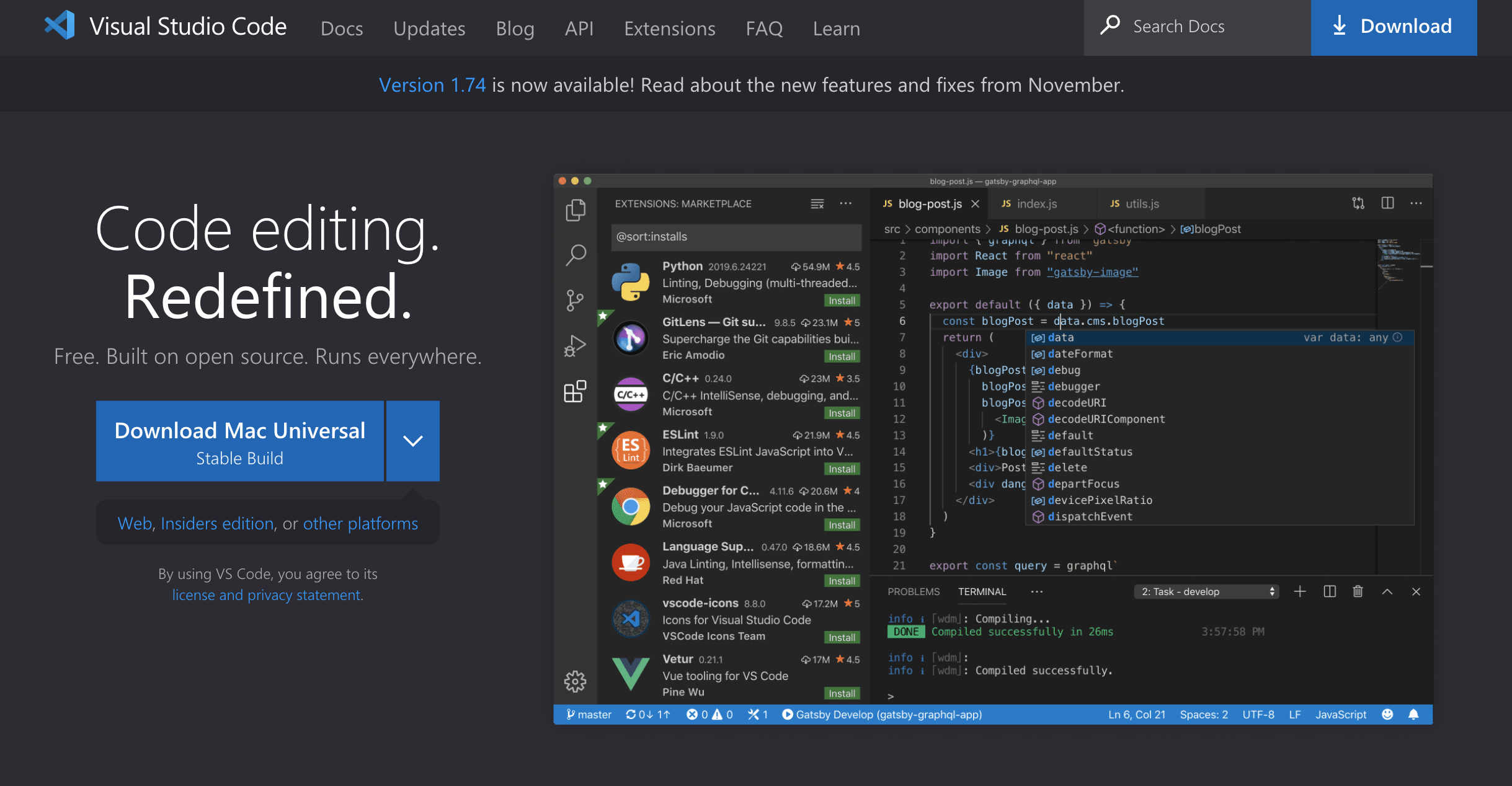 Visual Studio Code is a code editor redefined and optimized for building and debugging modern web and cloud applications. Visual Studio Code is free and available on your favorite platform - Linux, macOS, and Windows.